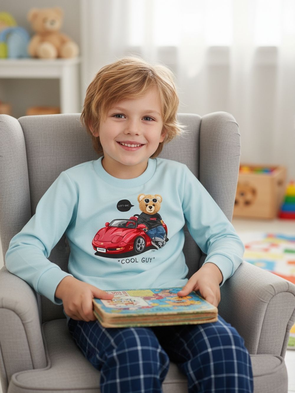 Štýlové chlapčenské pyžamo s červeným autom COOL GUY je ako stvorené pre malých milovníkov áut. Vrchný diel zdobí veselá ilustrácia macka sediaceho na športovom aute s nápisom. Vyrobené z mäkkej bavlny, poskytuje pohodlie počas celej noci a je šetrné k detskej pokožke. Tmavomodré nohavice s bielou kockovanou potlačou a elastickým pásom zaručujú voľnosť pohybu a pohodlné nosenie. Detské pyžamo pre chlapcov má dlhé rukávy a nohavice ideálne na chladnejšie noci.