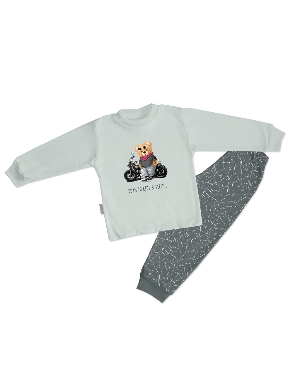 Originálne chlapčenské pyžamo s motorkovým mackom RIDER. Vrchný diel pyžama zdobí potlač macka na motorke s nápisom , čo dodáva outfitu hravý a rebelský charakter. Vyrobené z mäkkej bavlny, ktorá je príjemná na dotyk a šetrná k detskej pokožke. Tmavosivé nohavice s jemným vzorom a elastickým pásom zabezpečujú pohodlné nosenie počas celej noci. Detské pyžamo pre chlapcov má dlhé rukávy a nohavice, ktoré chránia pred chladom. Pohodlný strih neobmedzuje pohyb a podporuje pokojný spánok.