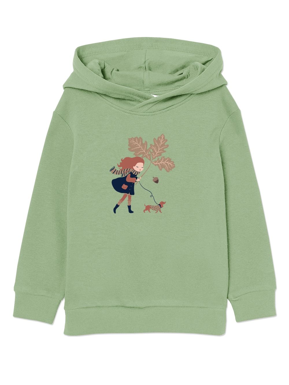 Táto dievčenská mikina s kapucňou je stvorená na chladné jesenné dni plné dobrodružstiev. Prednú časť zdobí ilustrácia dievčatka na prechádzke s psíkom pod padajúcimi listami, čo vytvára rozprávkový a hravý motív. Vyrobená z mäkkej látky, poskytuje príjemné teplo a pohodlie počas celého dňa. Kapucňa pridáva praktickosť a chráni pred vetrom. Dlhé rukávy a spodný lem sú zakončené pružným patentom, vďaka čomu mikina dobre sedí. Hnedý, ružový a zelený tón odráža farby jesene a ľahko sa kombinuje s nohavicami alebo teplákmi.